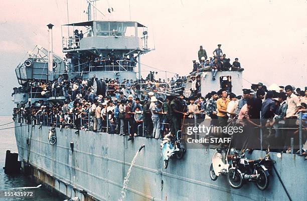 Jampacked with more than 7,000 refugees, the South Vietnamese Navy ship HQ-504 arrives at Vung Tau port, the South Vietnam’ s most popular sea resort, and now the only port city in the Government hands. More than 20,000 Vietnamese refugees including those from Hue and Da Nang arrived at Vung Tau from Cam Ranh Bay, on board the Navy ships. The cease fire agreement was signed during the international peace conference on Vietnam the 02 March 1973 in Paris. (Photo credit should read STAFF/AFP via Getty Images)